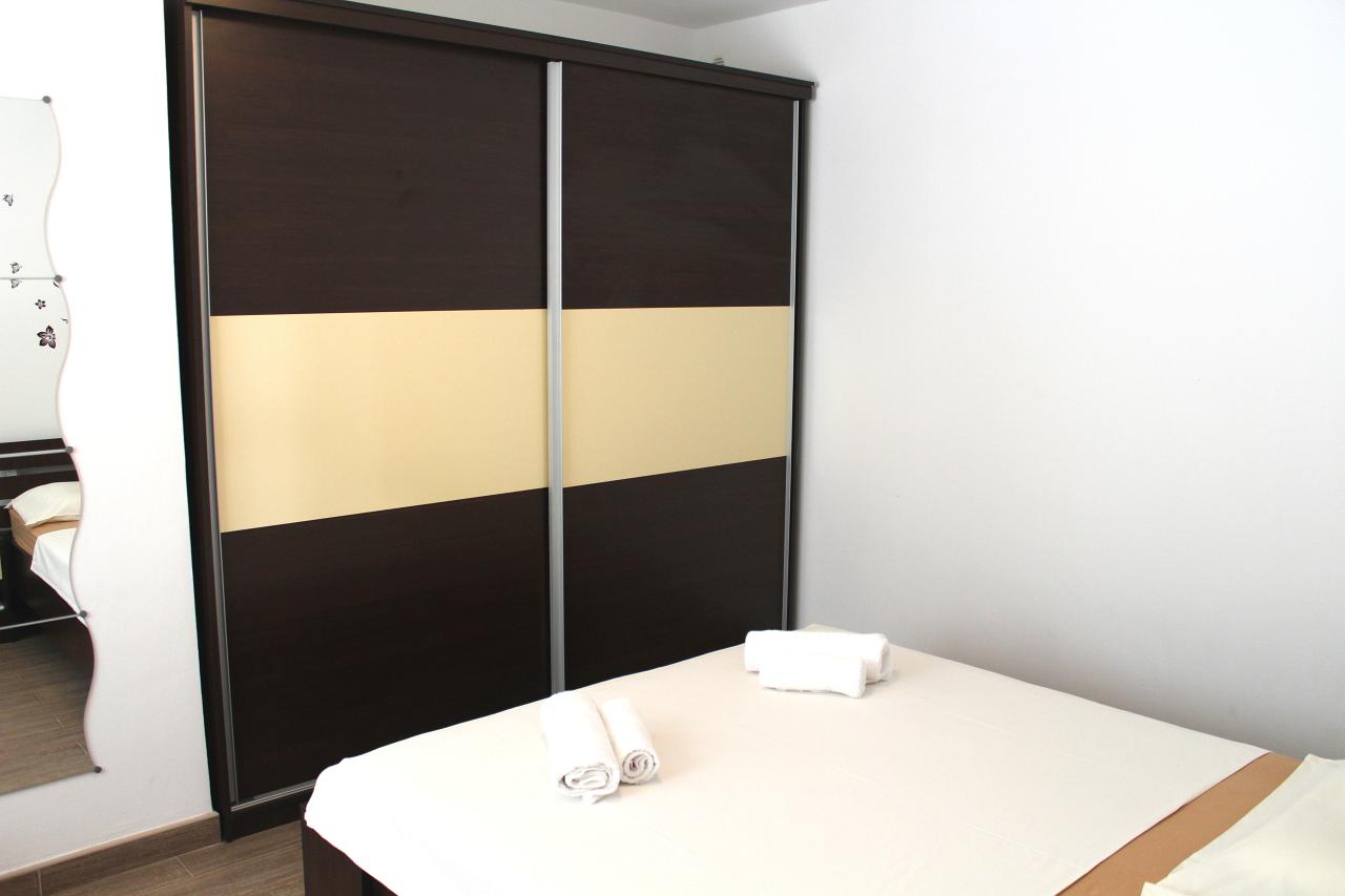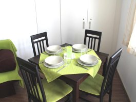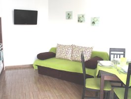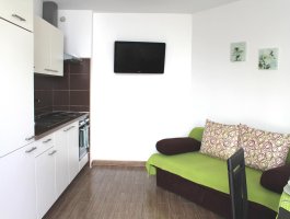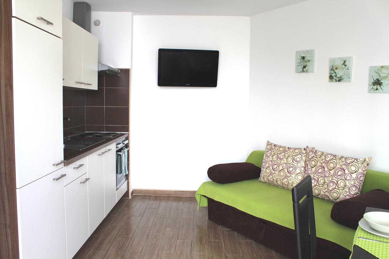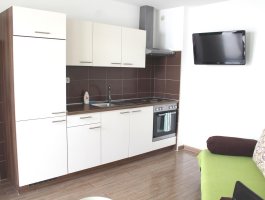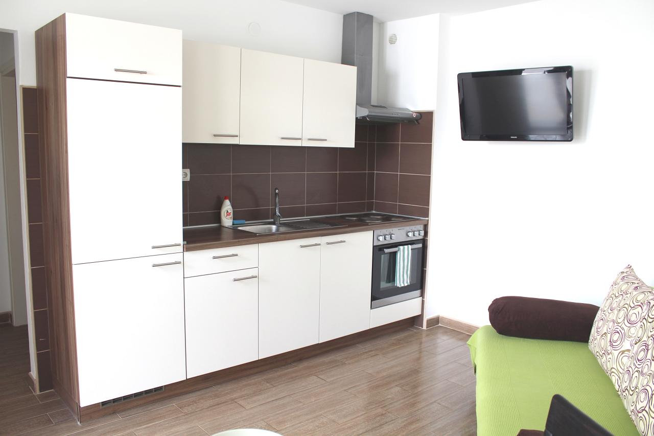 Kuhinja : kuhinjska niša, stol i stolice za sve osobe, posuđe za kuhanje te pribor za jelo u apartmanu, kuhinjske krpe uključene, električni štednjak, pećnica, hladnjak bez zamrzivača, filter aparat za kavu.