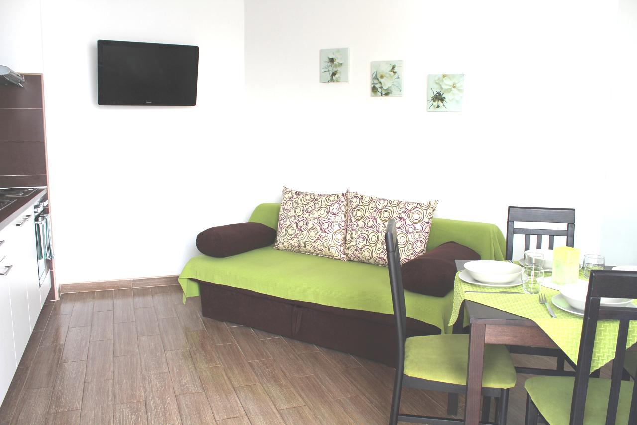 Dnevni boravak : dnevni boravak, blagovaonica i kuhinja su jedna prostorija, stol i stolice za sve osobe, dva pomoćna ležaja na jednom kauču, TV sat, pločice.