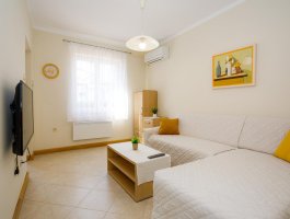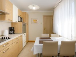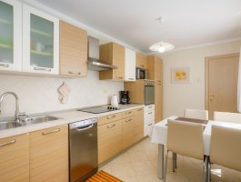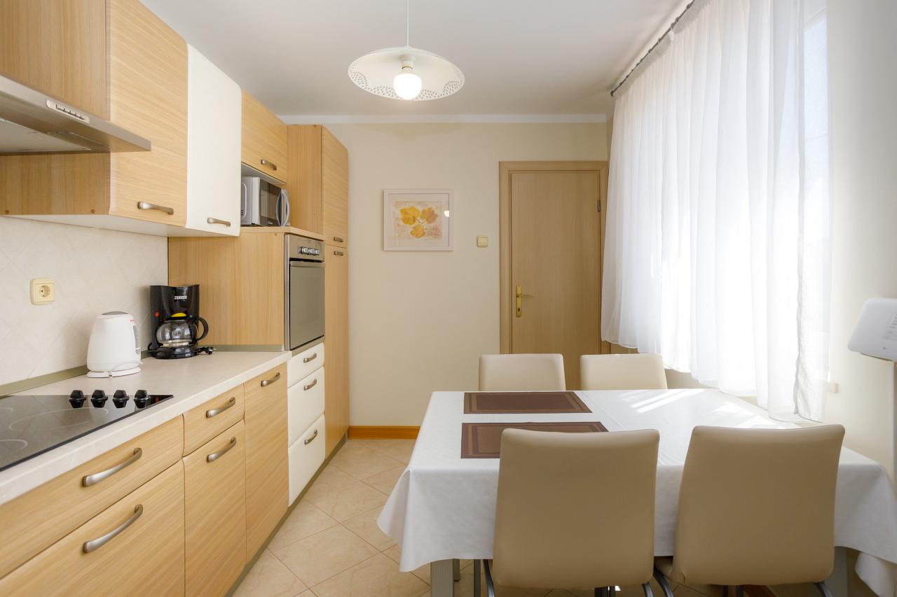 Kuhinja : stol i stolice za sve osobe, posuđe za kuhanje te pribor za jelo u apartmanu, kuhinjske krpe uključene, električni štednjak, pećnica, hladnjak sa zamrzivačem, filter aparat za kavu, kuhinja i blagovaonica su jedna prostorija.