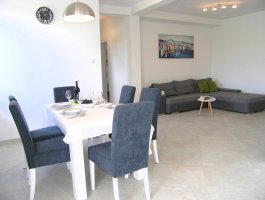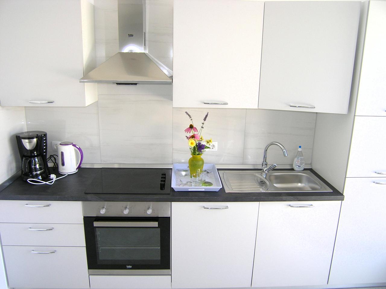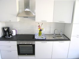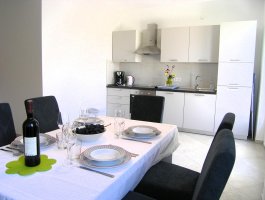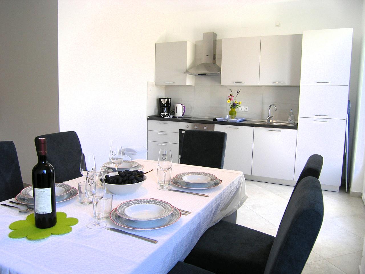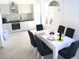 Kuhinja : stol i stolice za sve osobe, posuđe za kuhanje te pribor za jelo u apartmanu, kuhinjske krpe uključene, električni štednjak, pećnica, hladnjak sa zamrzivačem, filter aparat za kavu, perilica suđa.