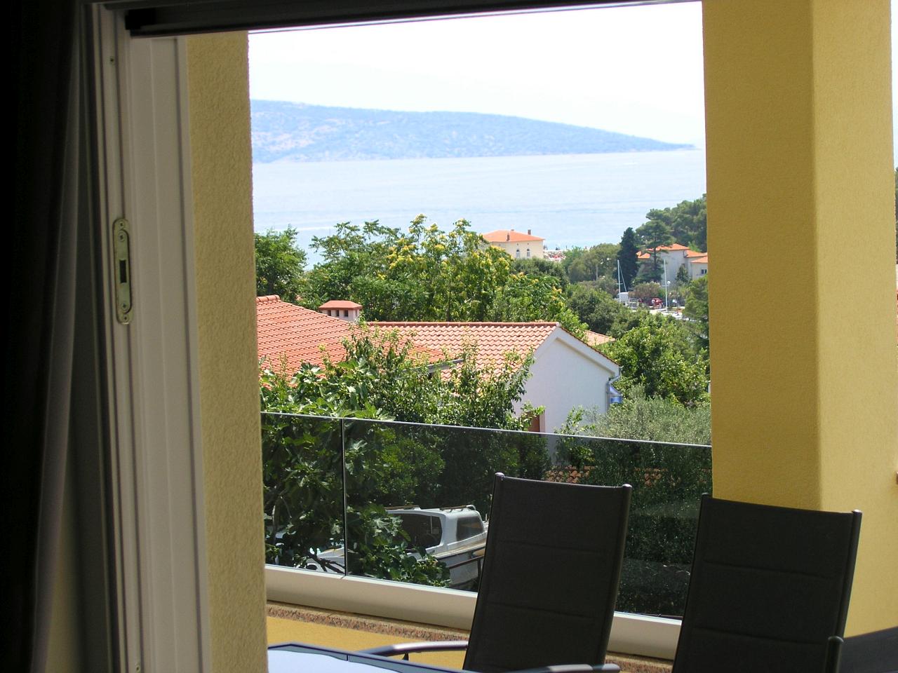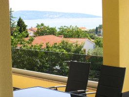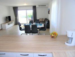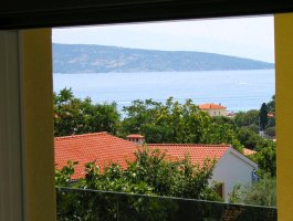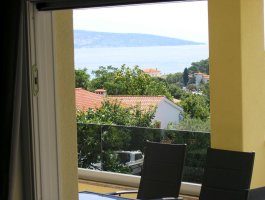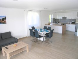 Dnevni boravak : dnevni boravak, blagovaonica i kuhinja su jedna prostorija, stol i stolice za sve osobe, jedan pomoćni ležaj na kauču, TV sat, pločice, izlaz na balkon, balkon s pogledom na more.