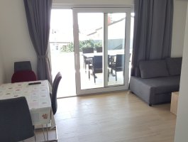 Dnevni boravak : dnevni boravak, blagovaonica i kuhinja su jedna prostorija, stol i stolice za sve osobe, jedan pomoćni ležaj, TV sat, pločice, s terasom.