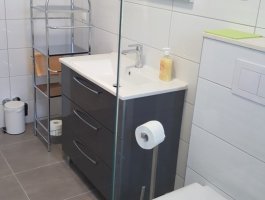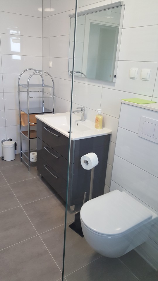 Kupaonica : kupaonica s wc-om i tušem, ručnici na raspolaganju (1 veliki, 1 mali po osobi po tjednu), perilica rublja, fen.
