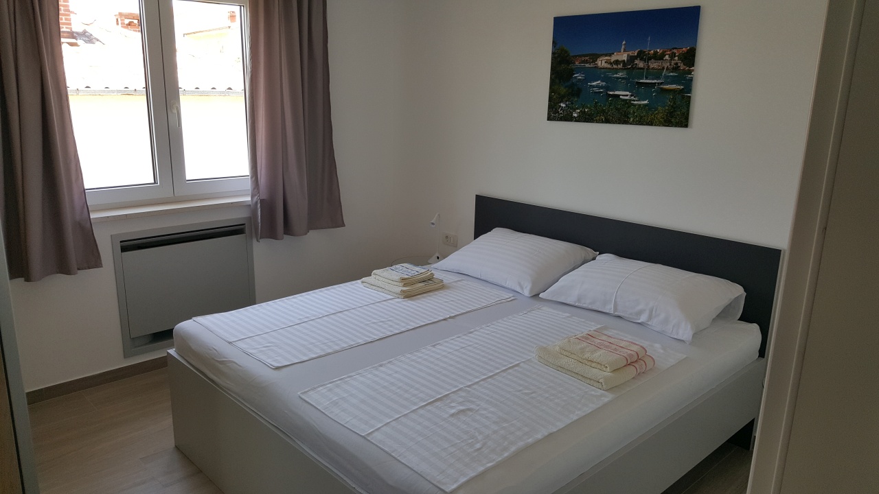 Spavaća soba : dvokrevetna soba, bračni krevet, pločice, krevetnina se mijenja svakih 7 dana.