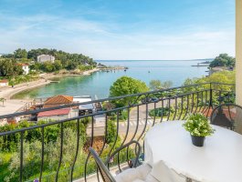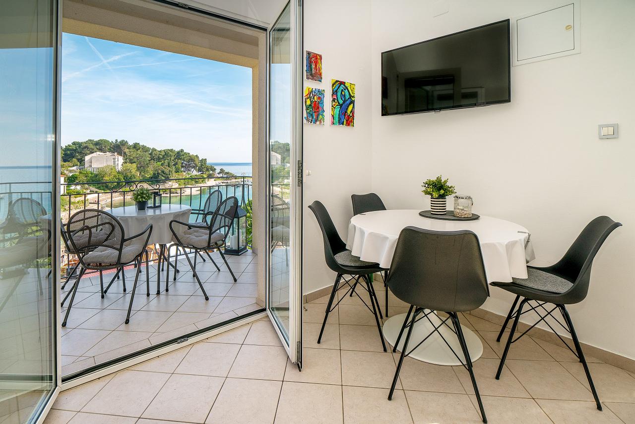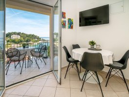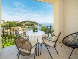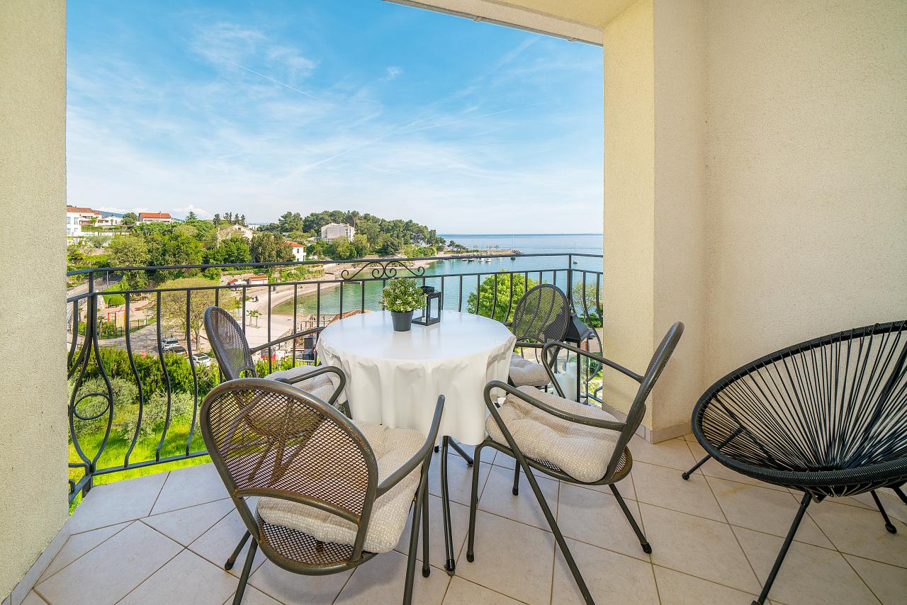 Balkon : vlastiti balkon, natkriven, pogled na more, stol i stolice na raspolaganju.
