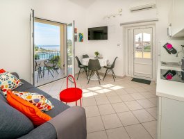 Dnevni boravak : dnevni boravak, blagovaonica i kuhinja su jedna prostorija, stol i stolice za sve osobe,kauč, TV sat, pločice, balkon s pogledom na more.
