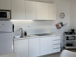 Kuhinja : kuhinjska niša, stol i stolice za sve osobe, posuđe za kuhanje te pribor za jelo u apartmanu, kuhinjske krpe uključene, električni štednjak, hladnjak sa zamrzivačem, filter aparat za kavu, kuhalo za vodu, mikrovalna, toster, perilica za suđe.