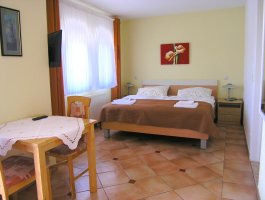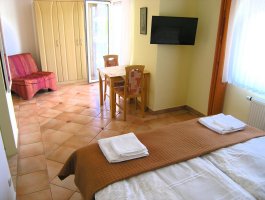 Studio (sve u jednoj prostoriji) : bračni krevet, s balkonom, stol i stolice za sve osobe, kuhinjska niša, posuđe za kuhanje te pribor za jelo u apartmanu, kuhinjske krpe na raspolaganju, hladnjak s malim zamrzivačem, električni štednjak, filter aparat za kavu, SAT-TV, pločice.