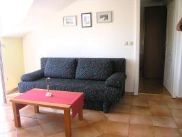 Dnevni boravak : dnevni boravak, blagovaonica i kuhinja su jedna prostorija, stol i stolice za sve osobe, jedan pomoćni ležaj na kauču, TV sat, pločice, s balkonom.