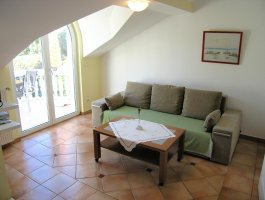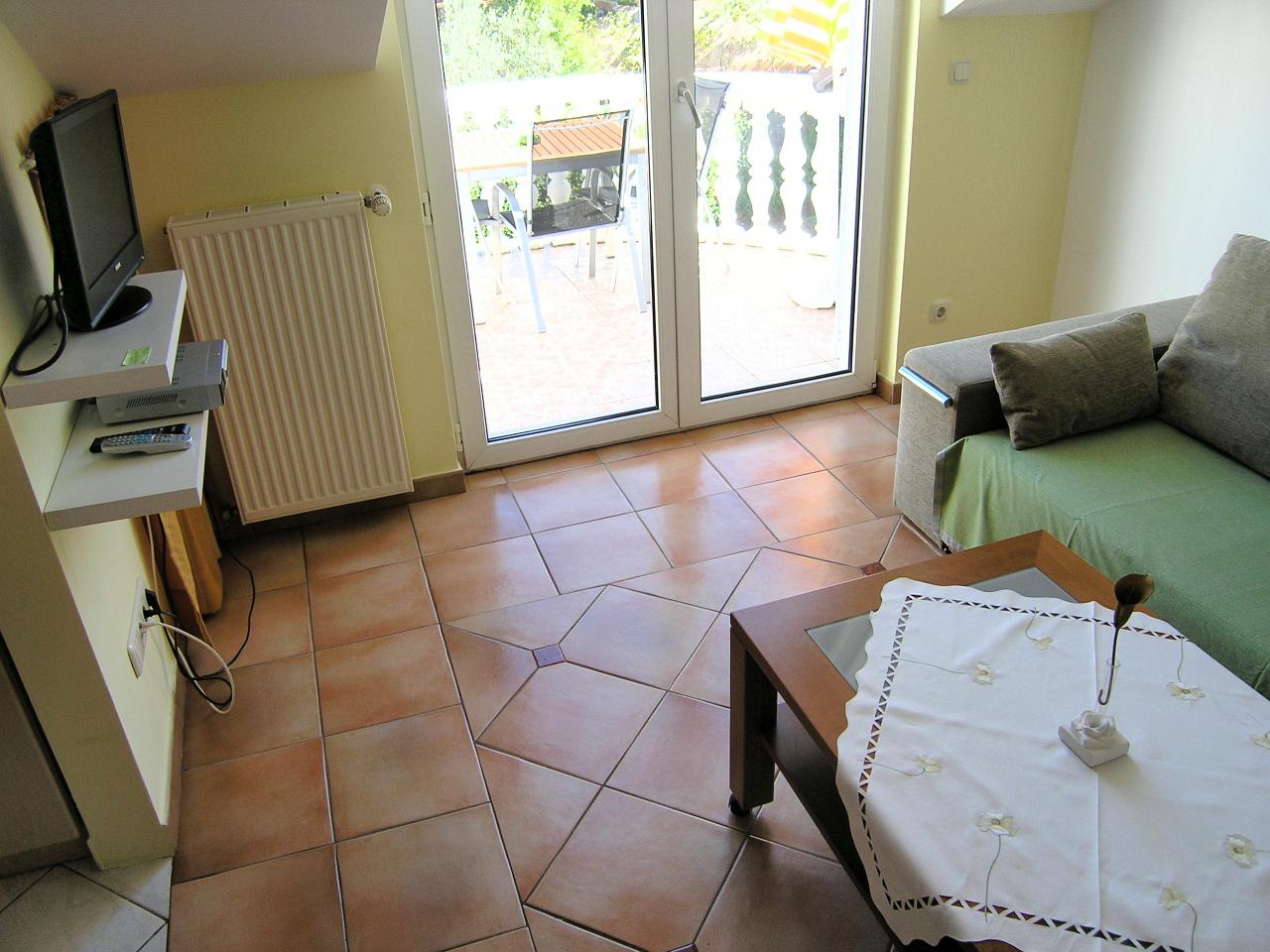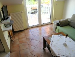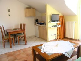 Dnevni boravak : dnevni boravak, blagovaonica i kuhinja su jedna prostorija, stol i stolice za sve osobe, jedan pomoćni ležaj na kauču, TV sat, pločice, s balkonom.