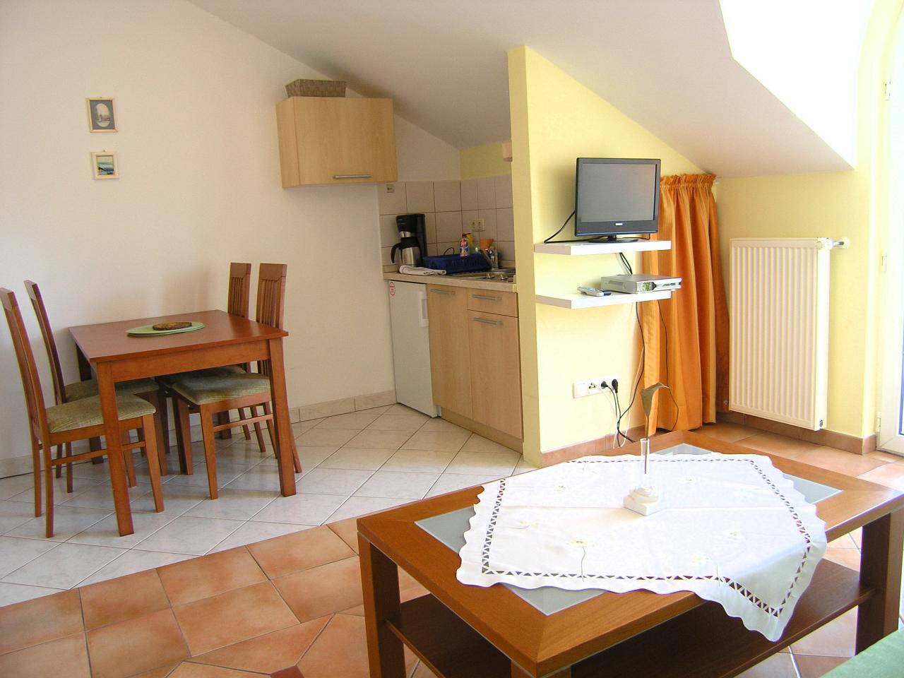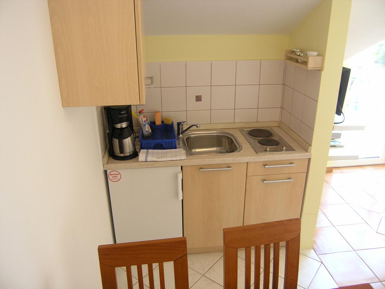Kuhinja : kuhinjska niša, posuđe za kuhanje te pribor za jelo u apartmanu, kuhinjske krpe uključene, električni štednjak, hladnjak s malim zamrzivačem, filter aparat za kavu.