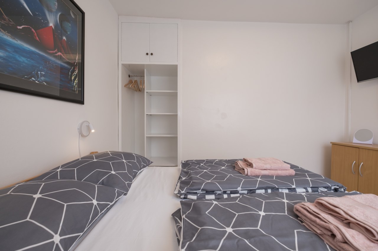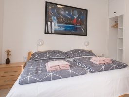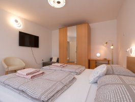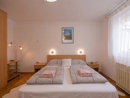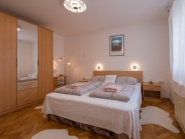 Spavaća soba : dvokrevetna soba, bračni krevet, jedan pomoćni ležaj, parket, krevetnina se mijenja svakih 7 dana.