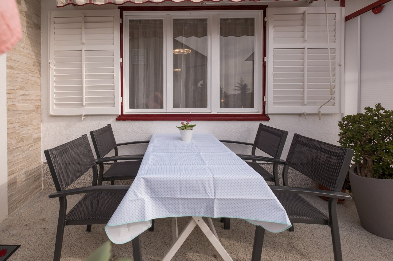Dnevni boravak : dnevni boravak, blagovaonica i kuhinja su jedna prostorija, stol i stolice za sve osobe, pločice.